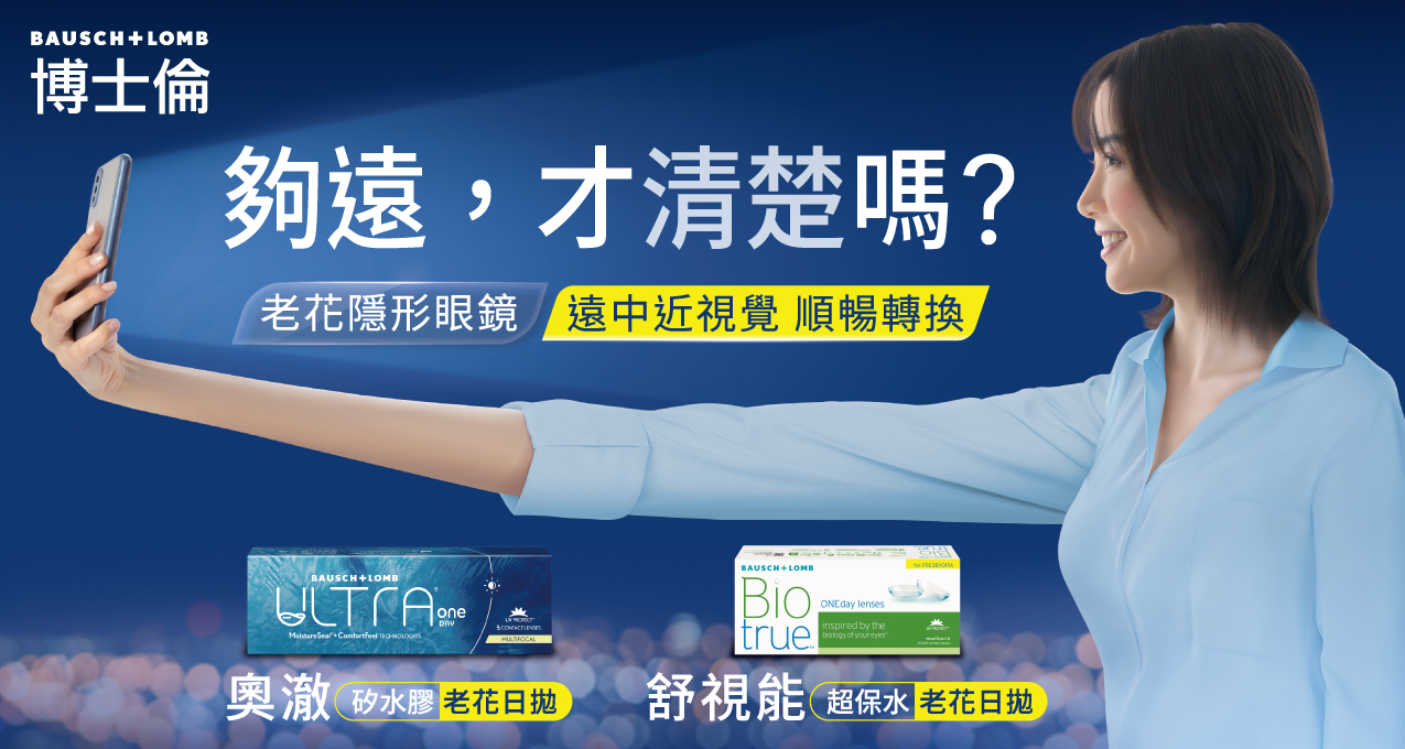 老花不是單純的退化,而是視覺升級的開始,生活正充滿各種挑戰與體驗的同時,而你的視覺不需要為此妥協。透過正確的驗光、合適的老花隱形眼鏡設計,你可以自在應對數位生活、工作與社交場景。現在就利用正確的科技輔助,一起升級視覺體驗!博士倫老花隱形眼鏡系列產品,讓你可以維持精彩且清晰的生活。最後也提醒,配戴任何隱形眼鏡前,務必諮詢眼科醫師或專業驗光人員,並定期進行眼睛健康檢查,才是照顧自身視覺的上上策。